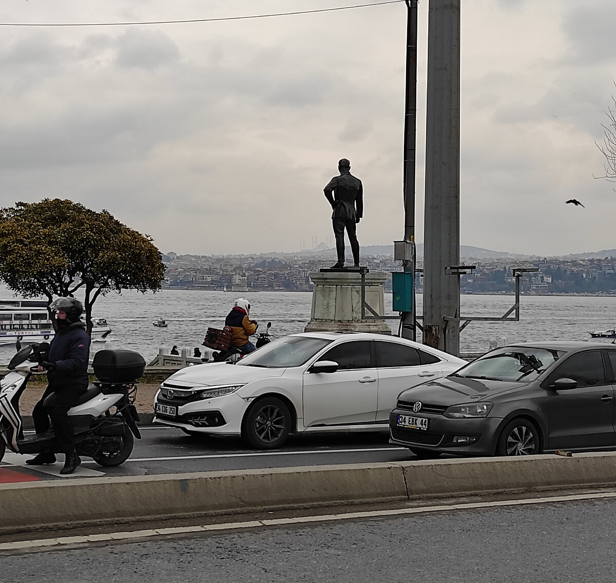 Памятников, портретов и прочих изображений Мустафе Кемалю Ататюрку (годы жизни 1881 -1938) в Стамбуле огромное количество. Как известно, его заслугами являются становление Турции как единого светского просвещённого государства, отход от законов шариата. Пройдя хотя бы метров 500, невозможно не встретить памятник или бюст Вид с другого ракурса на эту статую: Есть многофигурные композиции Следующий, снятый мной памятник, выполнен в ином стиле, он более условный и сложный. Постамент гладкий, скульптурная часть имеет неровную поверхность Культ первого президента настолько велик, что его портреты висят в кафе и магазинах Стена небольшого кафе вдали от центра украшена портретом молодого Ататюрка На железнодорожных и водных станциях - бюсты и портреты.. Лирическое отступление - ещё цитата М. К. Ататюрка, на которую наткнулась при уточнении информации (Википедия) Около станции электрички: В прекрасных парках Стамбула: В зале ожидания причала катеров: На причале пассажирских катеров маленьк