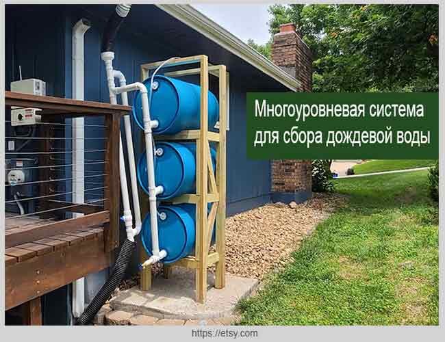 Такое многоуровневое размещение бочек — отличный способ сэкономить место во дворе и максимально увеличить сбор дождевой воды. В то же время, вертикальная установка емкостей увеличивает давление в поливочном шланге.