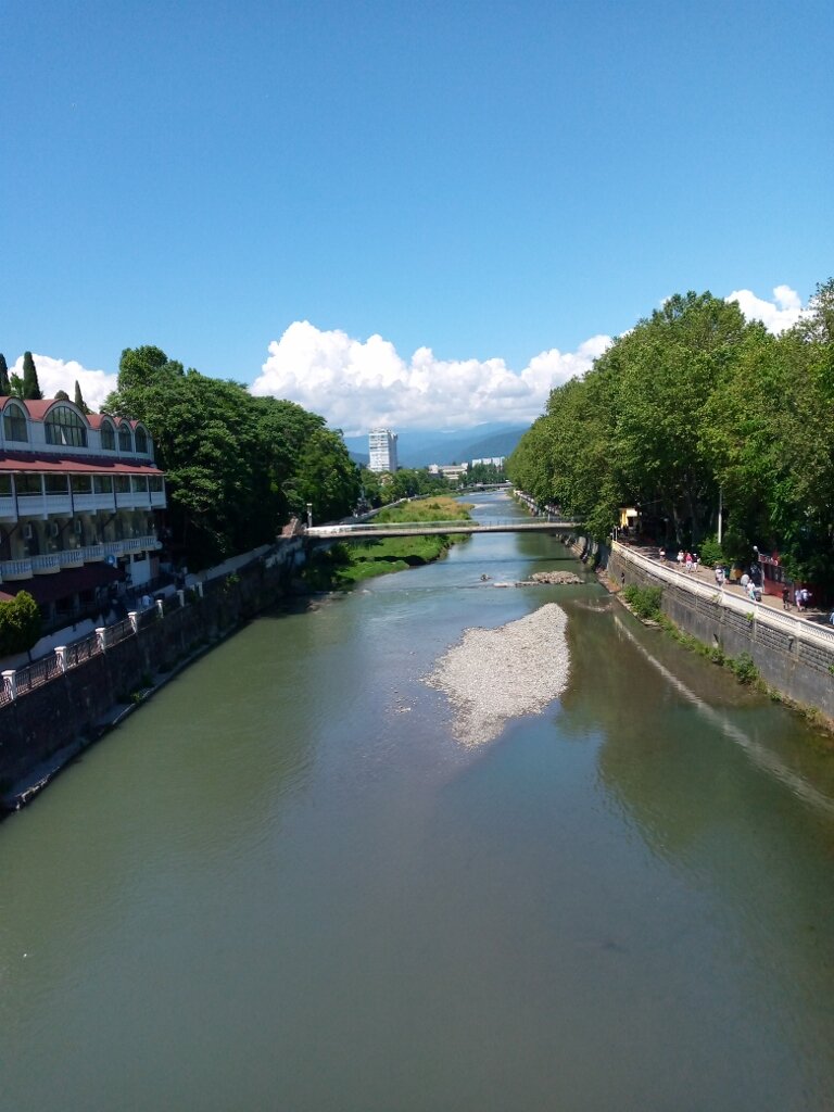 День выдался жаркий, но в тенистой аллее возле реки очень приятно пройтись. В Сочи, как и в Адлере, тоже широким и бурным потоком река вливается в море. Город стал прекрасным, нарядным, за последние годы невероятно преобразился. Вдоль реки широкая платановая набережная, уставленная скамеечками для отдых, есть даже бары со столиками.