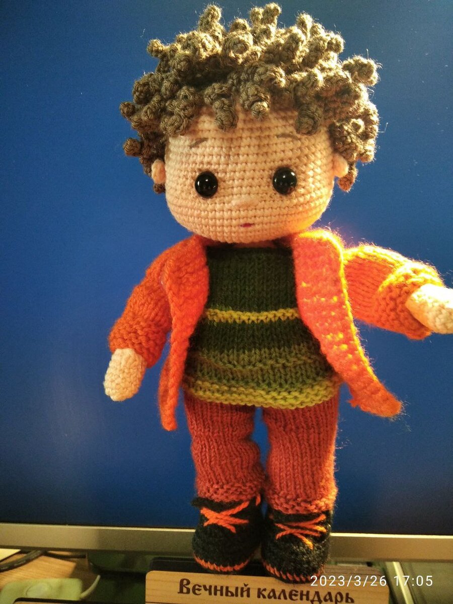 Эта игрушка изготовлена как сборная из многих МК. Одежду полностью придумывала сама. Все, что на кукле легко снимается. Все можно стирать. В комплект входят: футболка, брючки, кроссовки, курточка.