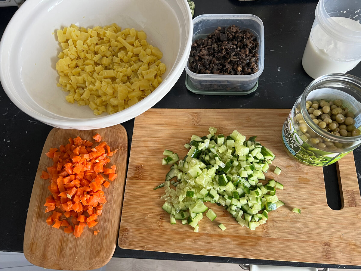 Также как обычно я нарезаю кубиками вареную картошку, морковь, огурцы, а вместо колбасы добавляю жареные шампиньоны. Кстати, хорошая замена колбасе или мясу, и сытно и вкусно.