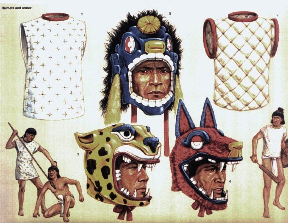 Основной защитой были стеганые хлопчато-бумажные доспехи ичкауипильи, толщиной в 2-3 пальца. В целом, не очень экзотично, стеганый доспех он везде стеганый доспех. встречаются поножи, наручи и шлемы, тоже простеганные. Наиболее богатые и знатные щеголяли нагрудными пластинами из серебра или даже золота, что дополнялось причудливыми украшениями из перьев.