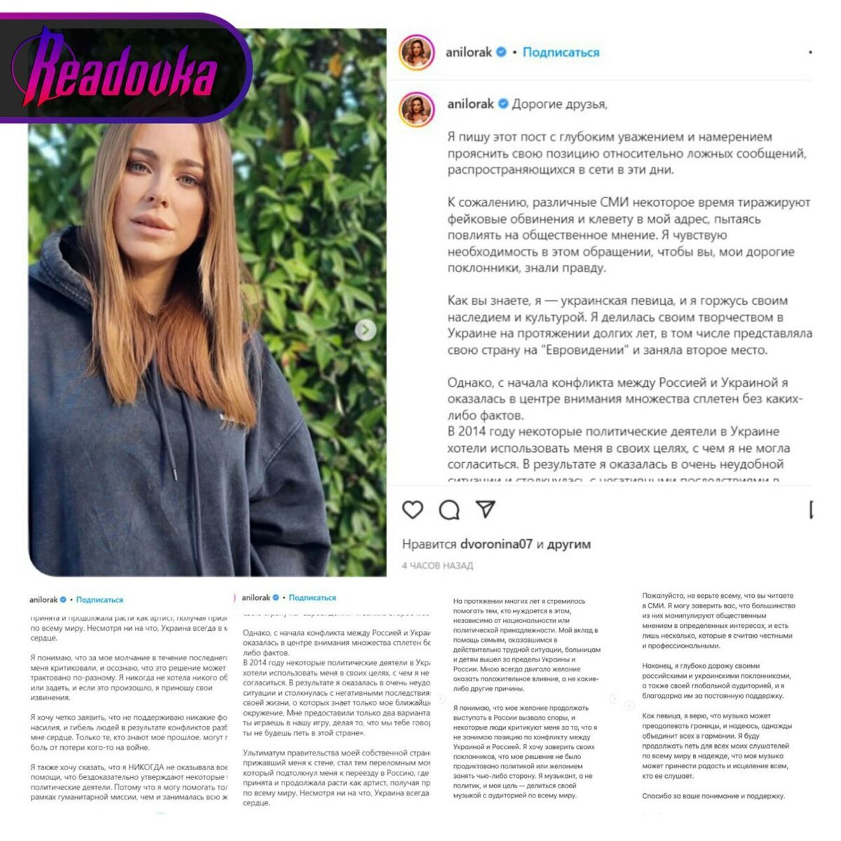 Певица выкатила слезный пост из-за отмены своего концерта в Краснодаре. Украинская певица Ани Лорак, которая еще совсем недавно собирала деньги на помощь «пострадавшим от российской агрессии», пытается продолжать дешевую игру на два фронта. Поставленная на место отменой концерта в Краснодаре Лорак опубликовала в своих соцсетях пост, жалостливым текстом которого попробовала вернуть доверие российской аудитории, при этом не обидев и украинскую. Также Лорак добавила, что не поддерживает «никаких форм насилия», а гибель людей в результате конфликтов «разбивает» ее творческое сердце. Заявляя о себе, как о певице «мира», Лорак почему то не объяснила, как так вышло, что она принимает участие в «гуманитарных миссиях», направленных только на помощь «украинским беженцам», полностью игнорируя при этом тяжелейшее положение людей на Донбассе. Пытаясь прикрыться сердечным благородством и заводя лицемерную пацифистскую шарманку о недопустимости насилия, Лорак на самом деле преследует только одну цель