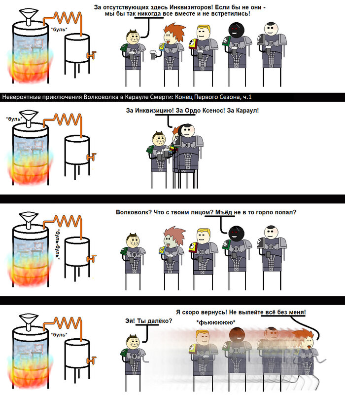 Конец Первого Сезона. Итак, новоиспечённые космодесантники Караула Смерти добились всего, чего хотели. Их броня приняла положенный покрас и они теперь могут считать себя полноценными членами этого братства избранных воинов тысяч миров. Почти всего... в самый разгар празднования Волковолк вспоминает, что он опять кое-что забыл... 1) 2) 3) 4) 5) Эпилог (Совсем) - Тайна Покраса. Броня покрашена... но не всё прошло гладко. Откуда у шлемов бывших непокрашенных такие необычные украшения??? 1) 2) 3) Прим.: Технодесантник, занимающийся покрасом из ордена "Странствующих Десантников". Этот орден относится к 23 Основанию ("Сторожевому") и является наследником Ультрамаринов. Это Основании произошло после событий Правления Крови и Чумы Неверия, когда Империум едва не пожрал сам себя. Орден Странствующих Десантников стал орденом вечных крестоносцев, что ведёт свои крестовые походы от самых границ Галактики до Ока Ужаса, сражаясь с бесчисленными отступниками, еретиками и ксеносами. И иногда даже пыта