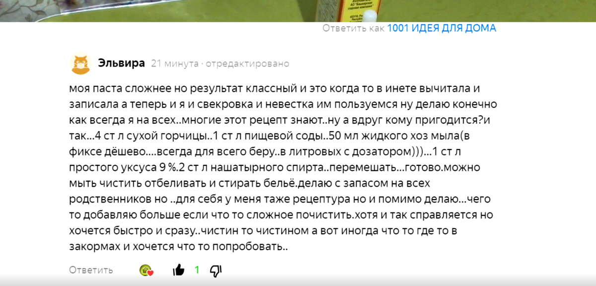 Приветствую вас, друзья мои! Сегодня у меня для вас интересный и полезный совет. Один из подписчиков посоветовал сделать пасту, которая, по их словам, даст отличные результаты. Судя по всему, вся семья нашего подписчика пользуется ею, и она превосходна. Мне стало любопытно, и я решил попробовать. Утверждается, что рецепт взят из Интернета. Для приготовления пасты вам понадобится горчичный порошок и пищевая сода. Необходимо жидкое хозяйственное мыло, но если его нет, можно развести в воде обычное мыло. Также вам понадобится обычный уксус и немного нашатырного спирта, который требует осторожного обращения. Приступаем к приготовлению пасты. В небольшую емкость добавляем четыре столовые ложки горчицы. Затем столовую ложку пищевой соды, затем жидкое хозяйственное мыло, столовую ложку уксуса и две столовые ложки нашатырного спирта. Все это тщательно перемешиваем, и паста готова к использованию. Наша подписчица утверждает, что эта паста может делать все - от чистки, отбеливания до стирки. Дал