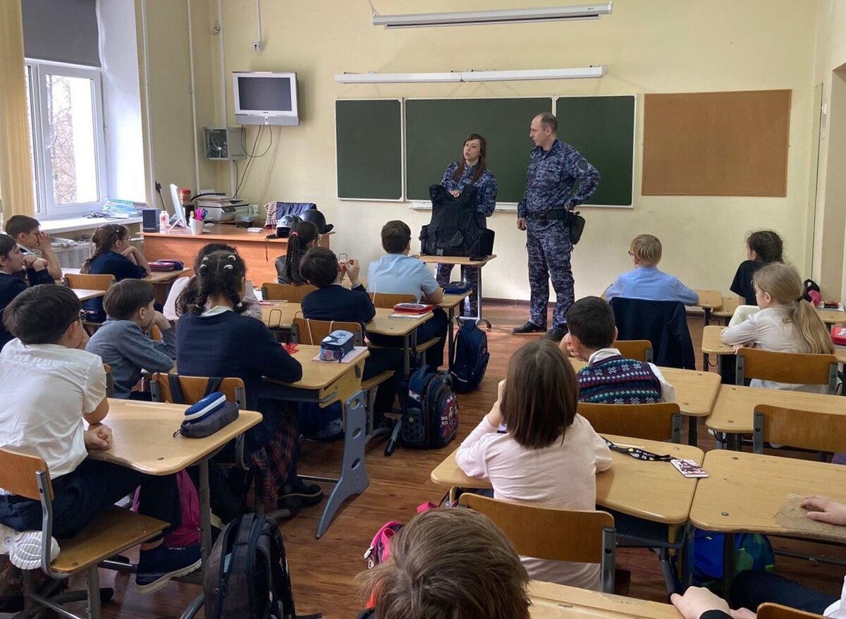 На уроке в школе Василеостровского района сотрудники Росгвардии ознакомили детей с историей создания и задачами, выполняемыми Федеральной службой войск национальной гвардии Российской Федерации, о деятельности регионального Управления вневедомственной охраны и о том, какую работу по охране правопорядка выполняют экипажи групп задержания.