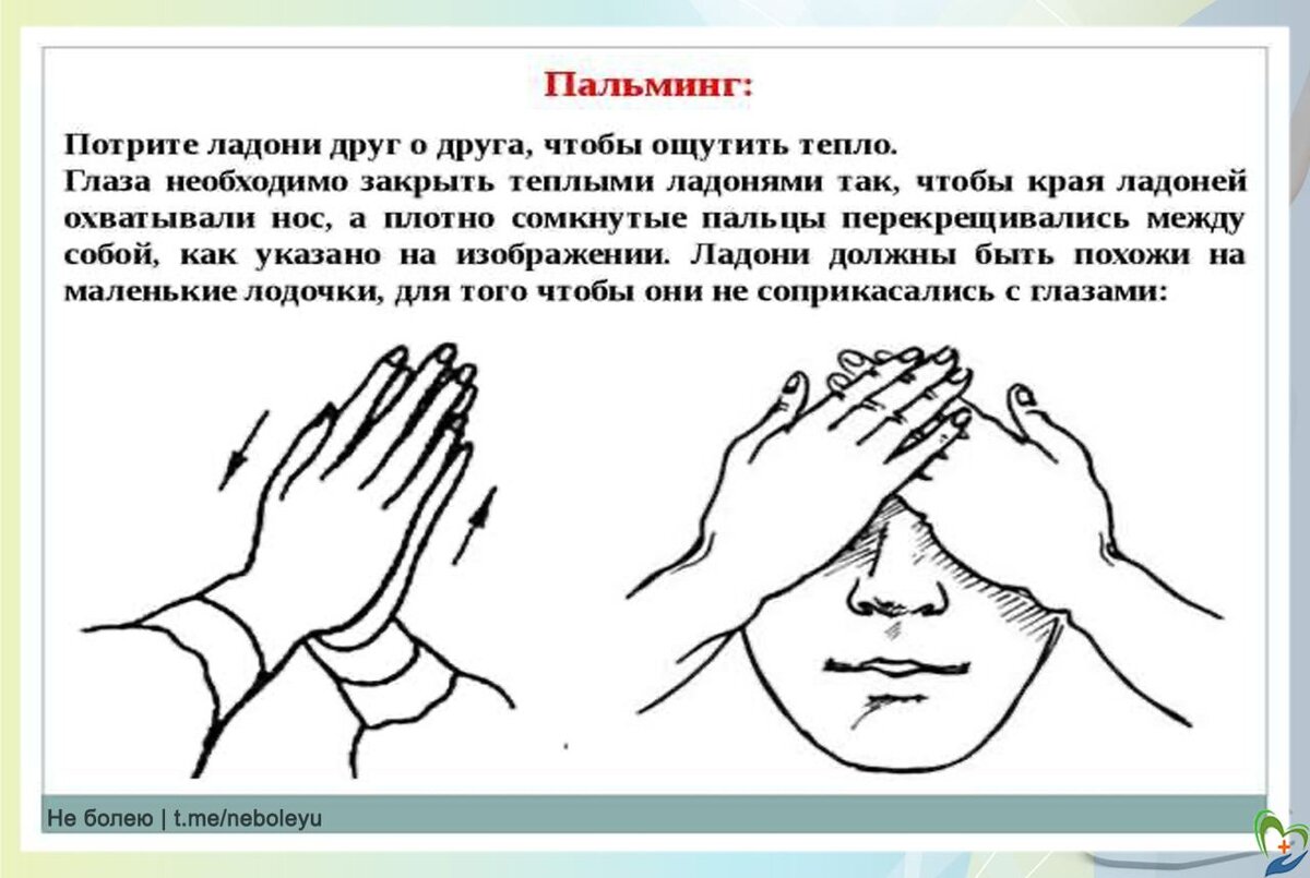 Используйте технику расслабления глаз - пальминг Что нужно делать? Горячие ладони кладем на глазные яблоки. Начинаем надавливать на глаза в следующем темпе: одна секунда- одно движение. Таким образом сделайте 30 движений за 30 секунд. Затем оставьте ладони на глазах и держите еще не менее тридцати секунд, а если у вас плохое зрение, то лучше около двух минут. В это время идет питание глазного яблока и всех рецепторов вокруг. Постепенно улучшится зрение. Будет восстанавливаться кроме зрения и натуральный цвет волос.