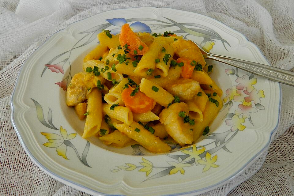 Тем временем отвариваем сами макароны и отправляем их к курице с соусом. Еще немного прогреваем и… Приятного аппетита!