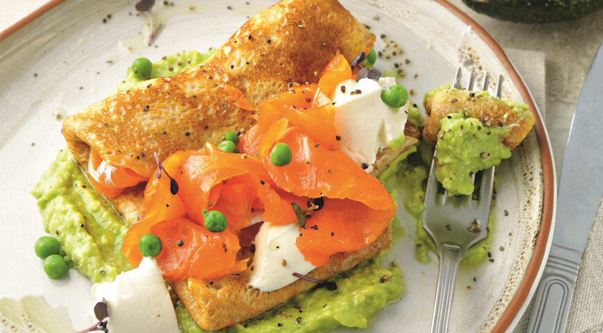 Как приготовить ржаные блинчики с форелью и сметаной на пюре из авокадо