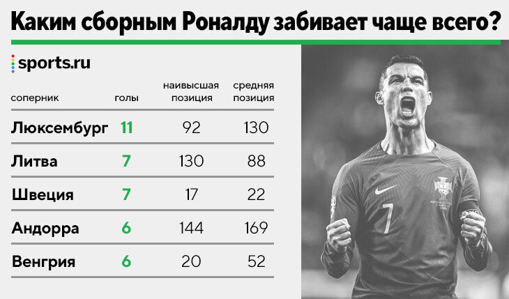 Второе место разделили между собой сборные Литвы и Швеции – в матчах с этими командами форвард сборной Португалии забил по 7 мячей. Третье место делят Андорра и Венгрия – на счету Роналду по 6 голов в ворота этих сборных.