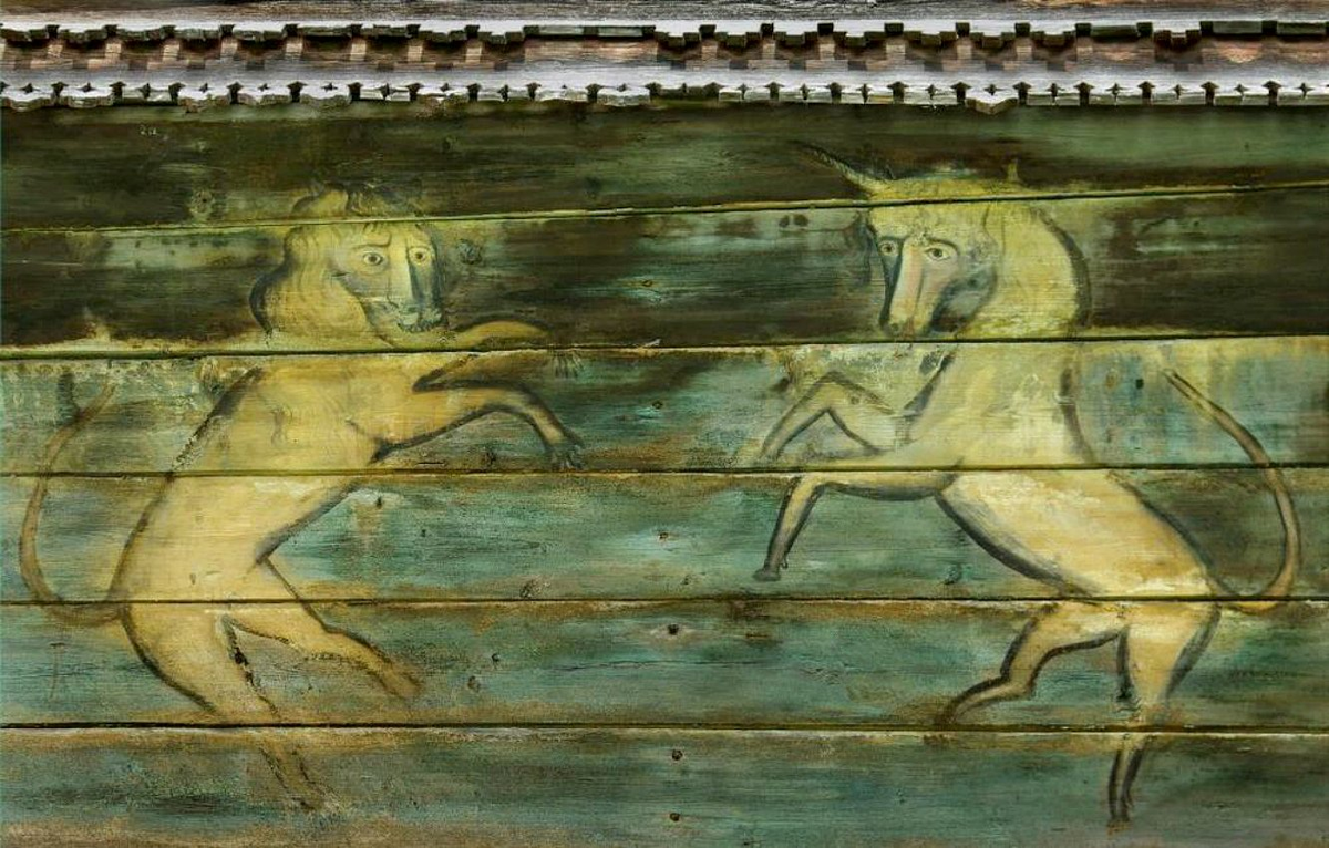 Интересно, что многие изображения написаны с нарушением пропорций. Некоторые детали совсем не соответствуют действительности. Например, на этой росписи у единорога видны клыки, а голова льва явно больше, чем нужно.