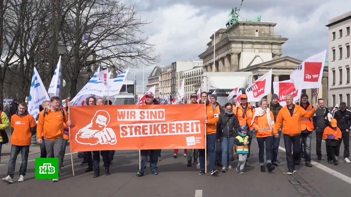 [ Смотреть видео на сайте НТВ ] В Германии парализовано железнодорожное сообщение, во многих федеральных землях остановился общественный транспорт, из крупных аэропортов работает только берлинский. В стране проходит одна из крупнейших забастовок за последние 30 лет. В Германии этим утром началась крупнейшая за последние 30 лет забастовка. Практически по всей стране не ходит общественный транспорт. Парализовано железнодорожное сообщение, во многих федеральных землях не ходят автобусы, из крупных аэропортов работает только берлинский. На машинах немцы тоже вряд ли далеко уедут. Бастуют работники автобанов, накануне они грозились перекрыть туннели. Главное требование транспортников — повышение зарплат на 10%. Люди жалуются, что из-за высокой инфляции им не хватает денег на жизнь. Участники акции протеста возмущены и заявляют, что не хотят платить за кризис, в котором виноваты власти. Эта забастовка, по словам организаторов, предупредительная, она продлится весь день. Если не будут приняты