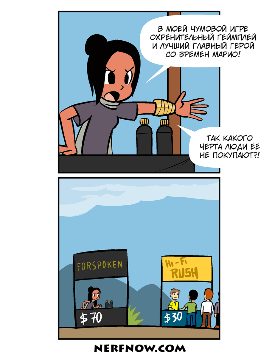 Прошло еще только три первых месяца, а в 2023 году уже успело появиться на свет множество отличных игр. Некоторые из них вызвали особенно бурные обсуждения в сети, а также стали вдохновением для фанатского творчества. Комиксисты тоже не остались в стороне - сейчас в сети уже можно найти множество смешных зарисовок, посвященных персонажам таких игр, как Atomic Heart или Hogwarts Legacy. Поэтому я решил собрать для вас подборку небольших комиксов по игровым новинкам этого года. Надеюсь, что вам понравится. И обязательно пишите в комментариях, в какие игры вы уже успели поиграть в этом году! В январе состоялся релиз таких игр, как Forspoken и Hi-Fi Rush. И если первую игру в сети все чаще ругали, то вторая стала для многих неожиданным открытием. Художник Жозуэ Перейра (Josué Pereira) - автор серии Nerf NOW!! («Понерфи СЕЙЧАС!!») - решил посвятить один из своих комиксов противостоянию вышеперечисленных игр за внимание геймеров. В начале февраля вышла Hogwarts Legacy - RPG, основанная на ми