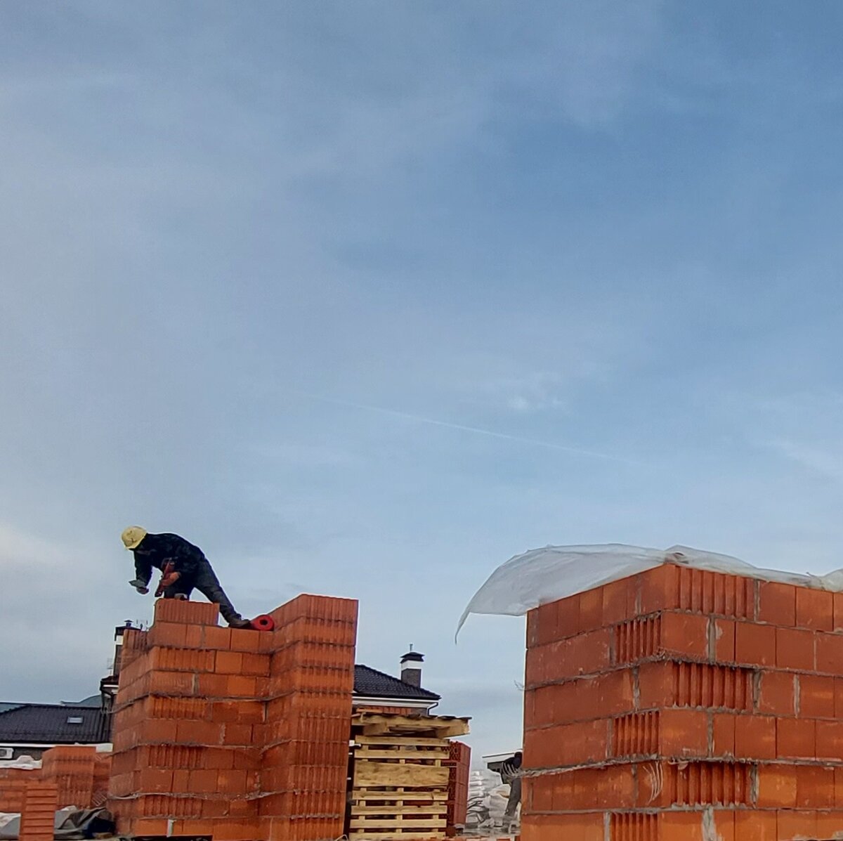 В премиальном поселке Миллениум Парк рабочие приступили к кладке наружных стен 1-го этажа из крупноформатных керамических блоков «Гжельского кирпичного завода». Это высокотехнологичный и очень теплый стеновой материал, использование которого ускоряет темпы возведения коробки и снижает расход кладочного раствора на 30%. Кладка стен из блоков выполняется на «теплый» кладочный раствор @perfekta «Линкер Термо» с использованием базальтовой сетки. Она укладывается в растворные швы между блоками с шагом 2 ряда по высоте. В составе кладочного раствора 15% перлитового песка, который позволяет уменьшить потерю тепла через швы и стены дома, защищает кладку от образования плесени. Эти и другие строительные материалы на объект в Миллениум Парк поставляет наш партнер — компания @unimart24. Смотрите предыдущие посты и видеоролики с этого объекта по хэштегу: #дом_в_стиле_французской_неоклассики_мп. #кладкастен #монарх #блокимонарх #блокигжель #гкз #гжельскийкирпичныйзавод #кирпичмонарх #перфекта #клад