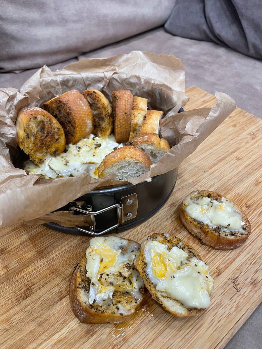 Привет! Мы часто собираемся с друзьями на посиделки, играем в настолки, слушаем музыку, болтаем и, конечно, вкусно едим. Недавно открыли для себя сочетание расплавленного камамбера с хрустящими ломтиками багета, предварительно смазанными маслом и специями. А какой аромат разлетается по всему дому! Стоит попробовать Готовила я под Нору Джонс. Ох, идеальнее не бывает. Романтичное настроение обеспечено. Если не знакомы, то знакомлю вас с ней:) Подготовка к готовке Наша задача купить самый любимый багет) Нам понадобится: Я очень советую камамбер от "President" Приступаем к готовке 1. Экономим время - заранее разогреваем духовку до 180°C 2. Нарезаем багет 3. На сыре делаем такой узор 4. Сладкую паприку(1/2 ч.л), черный перец(совсем немного), сушеный чеснок(1/3 ч.л) и базилик(1/3 ч.л) заливаем оливковым маслом. Перемешиваем. Можно использовать итальянские травы. 5. Любую форму для запекания (у меня вообще для тортиков) застилаем бумагой для запекания. В центр кладем сыр. Обмакиваем ка