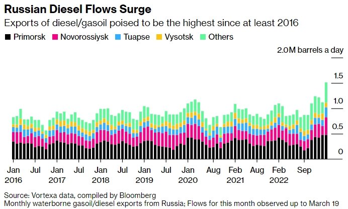 Поставки дизельного топлива из России за первые 19 дней марта составили около 1,5 млн баррелей в сутки, согласно данным Vortexa Ltd., собранным Bloomberg в пятницу. Если этот показатель сохранится, в этом месяце будет наблюдаться самый высокий экспорт данных с начала 2016 года.