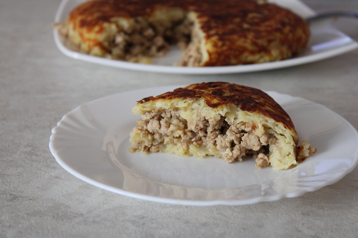 Этот рецепт прочно укоренился в нашей семье. Еще бы, продуктов минимум, а получается вкусно и много, хватает на всю семью, еще и на завтрак остается (иногда). Для этого пирога не нужно тесто, вместо него используем картофель. Но обо все по порядку. Первым делам подготавливаем начинку. Для этого на растительном масле обжариваем сначала лук до прозрачности, а затем добавляем к нему фарш, у меня свиной. Обжариваем все до полной готовности с добавлением соли и специй. Еще для вкуса я добавляю две столовые ложки соевого соуса, но это не обязательно. Тем временем очищаем и натираем с помощью крупной терки картофель. Добавляем яйца, соль и специи. Хорошо перемешиваем. Когда фарш будет полностью готов перекладываем его в тарелку. Сковороду хорошо протираем и снова наливаем растительное масло. Выкладываем половину натертого картофеля как показано на фото выше. Далее выкалываем ровным слоем фарш и сверху оставшийся картофель. Накрываем сковороду кр