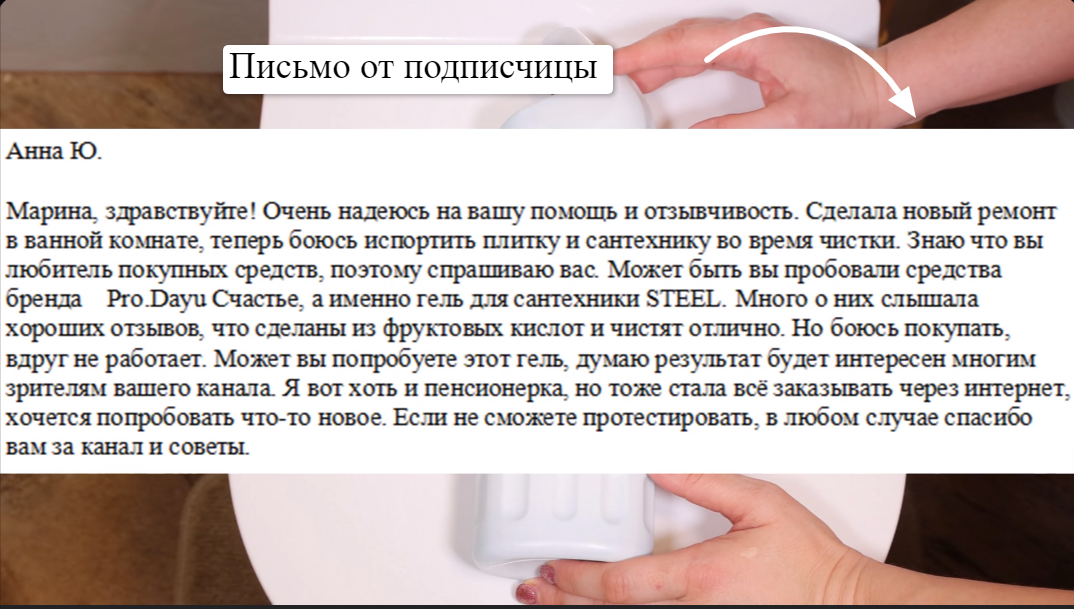Приветствую, вы на канале “Марина Жукова” – канале о бюджетной чистоте и порядке. Протестируем новинку бытовой химии. Бренд “PRO.DAYU Счастье”, средство называется “STEEL”, гель для сантехники. Получила письмо от подписчицы в котором указывается, что она полностью отказалась от агрессивной бытовой химии, поскольку сделала свежий ремонт. В письме просьба протестировать это средство. В нем содержаться мягкие фруктовые кислоты с приятной отдушкой. Без резкого запаха химии, не содержит хлора. Консистенция густая. №1 Унитаз 🔶Нанесите гель под ободок. Распределите гель ершиком. Оставьте контактировать. Пока средство контактирует, почистите сидение и крышку. Спустя 5 минут гель все еще держится на стенках унитаза – это значит, что он все еще контактирует с поверхностью унитаза. При контактировании нет никакого резкого химического запаха. 🔶Почистите ершиком унитаз. Смойте средство. Оцените результат Внутри все чисто. Сидение и крышка чистые. №2 Раковина Известковые и мыльные отложения, в