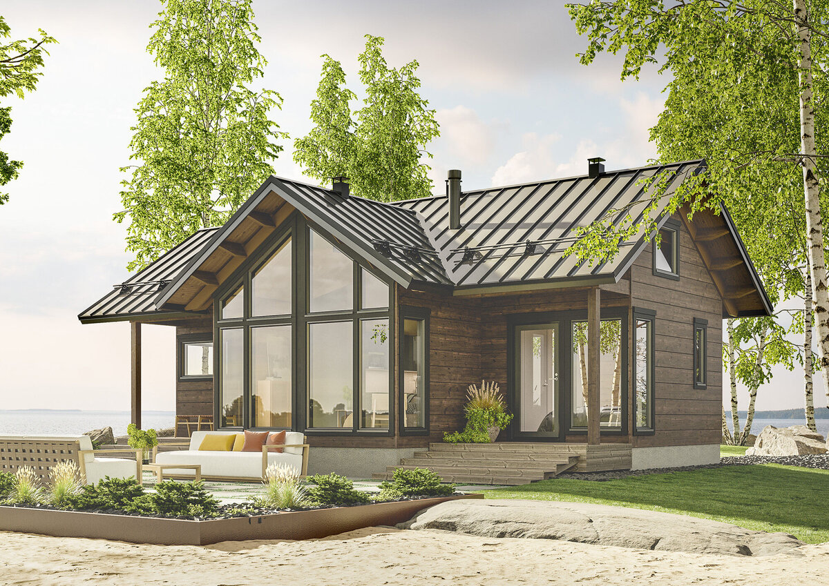 Маленький дом — это не обязательно ущерб для комфортного проживания. Особенно если экстерьер выполнен в скандинавском стиле, а его внешний вид подчеркивает элегантный стеклянный эркер. Он возводится на самом ярко освещенном углу дома, иначе говоря — на «глазах у солнца». Этот элемент, несомненно, добавляет ощущения простора и уникально дополняет общий дизайн придавая ему неповторимый шарм. Знакомьтесь с проектом Kajo 50 (общая площадь: 62 м2). Большие окна от пола до потолка дают возможность наслаждаться панорамным видом на окрестности, и восхищаться домом снова и снова. Kajo имеет аккуратный и приятный внешний вид, и становится отличным выбором для тех, кто ищет маленький, но функциональный дом в скандинавском стиле с высокими потолками и панорамным остеклением. Планировка. В доме предусмотрен небольшой коридор, кухня гостиная, санузел и спальни — 2 на первом этаже, и 1 на втором. Верхнее пространство дома располагает к уединению и творчеству. Комната отдыха с видом на природу не ост