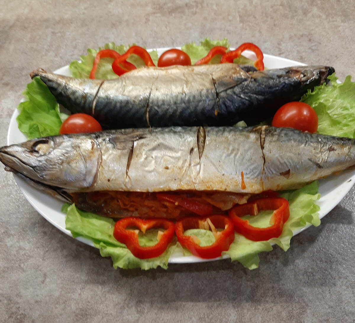 Блюда в кулинарном рукаве получаются сочными, вкусными и без лишнего жира. Я уже публиковала некоторые рецепты блюд в рукаве для запекания: Делюсь ещё одним замечательным и быстрым рецептом. Это идеальное блюдо для тех, кто на диете! ИНГРЕДИЕНТЫ: Скумбрия свежемороженая - 2 шт. Лук репчатый - 1 шт. Перец болгарский - 1 шт. Морковь - 1 шт. Растительное масло - 2 ст.ложки. Соль, перец, специи - по-вкусу. ПРИГОТОВЛЕНИЕ: Скумбрию разморозить, выпотрошить, промыть, обсушить. Сделать небольшие надрезы поперёк спинки. Смешать соль, перец, специи (у меня - для рыбы). Натереть этой смесью рыбу. Оставить минут на 30. Лук нарезать полукольцами. Перец - соломкой. Морковь натереть на крупной тёрке. Овощи выложить в сковороду, добавить растительное масло и тушить на медленном огне до полуготовности, немного посолить. Начинить овощами рыбу, уложить в рукав. Завязать рукав, сделать несколько проколов зубочисткой. Выпекать 30 минут при температуре 200 градусов. И наша скумбрия с овощами в рукаве готова