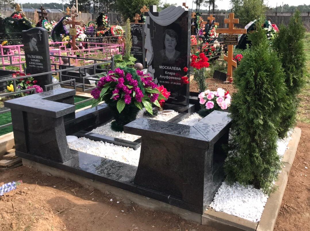 Недавно наша компания изготовила и установила комплекс на могилу на одном из кладбищ Московского региона. Композиция состоит из фигурной стелы с крестом, прямоугольной тумбы, цветника открытого типа и цоколя с гранитными лавочками. Вся конструкция выполнена из Габбро-диабаза, с полировкой и без неё (плащаница, бутоны). Надгробная плита оформлена при помощи лазерной технологии (портрет, ФИО, даты рождения и смерти, рисунок). В цветник и вокруг памятника выполнена засыпка декоративным щебнем, также произведено озеленение. Гранитная мастерская "Память М" - изготовление мемориальных комплексов. Каталог моделей представлен на нашем сайте, выбирайте размер, материал и варианты оформления в удобном калькуляторе.