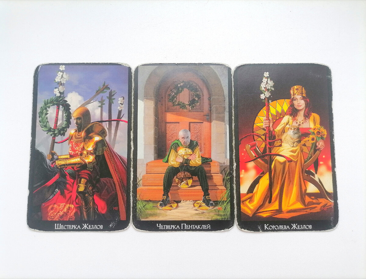 Выпали 6 Жезлов, 4 Пентаклей, Королева Жезлов. Я использовала колоду Колдовское Таро.
