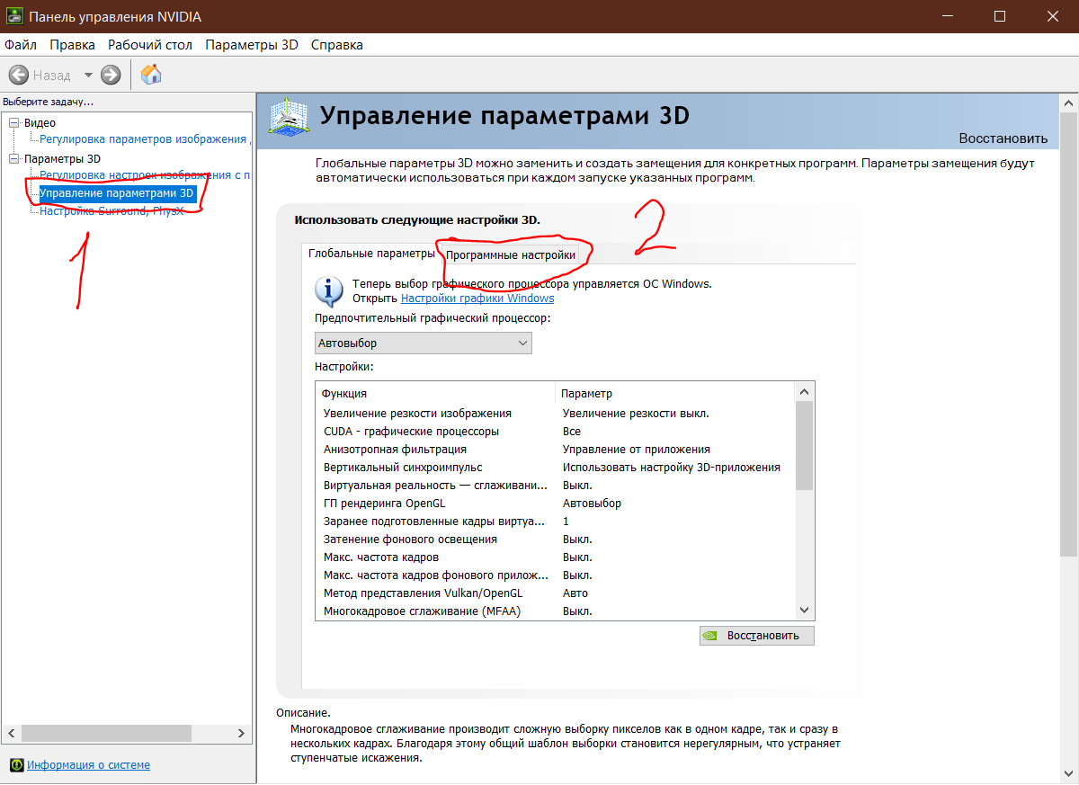 1. Кликнете правой кнопкой мыши на рабочем столе и выберете: Панель управления NVIDIA 2. Нажмите на "Управление параметрами 3D" а затем на "Программные настройки" Вот и всё, теперь в вашей игре будет большее количество кадров, Я заметил, некоторые старые игры по дефолту запускаются на интегрированной видеокарте, поэтому думаю если возникнет проблема с низким fps в другой Олдовой игре, её можно решить таким же способом. P.s При ультра настройках графики всё равно низкий FPS но при Высоких параметрах 70+FPS