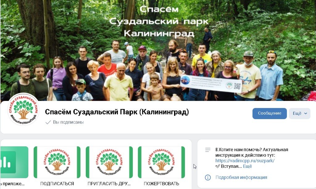 Команда защитников Суздальского парка в Калининграде за два года добилась отмены застройки и создания особо охраняемой природной территории. Сохранения природных территорий можно добиться, объединившись и действуя последовательно и неотступно. Что делать? Инструкция в фотографиях*. 0. Объединиться с единомышленниками – соседями, экологическими активистами. Завести группу кампании по спасению парка в ВК, ОК; при необходимости – чаты в мессенджерах. 1. Еженедельно проводить уборки. В конце делать фото с плакатами, призывающими сохранять природную территорию. 2. В теплый сезон устраивать велопробеги, посвященные сохранению парка. 3. Объявить бессрочный флешмоб за сохранение парка и регулярно публиковать в группе фото участников флешмоба. 4. Призывать сторонников оставлять комментарии под постами губернатора вашего региона, местной администрации. 5. Публиковать в группе фотографии видов природной территории с описанием растений и животных и их ценности для экосистем. 6. Открыть в нескольки