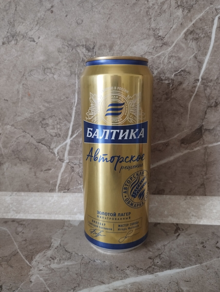 Купил в Пятёрочке за 60р банку 0.45 литра. Все мы знаем про авторское решение в чёрной банке и я не столь давно даже делал обзор, в котором совершенно заслуженно то пиво поругал. Золотая банка угрожает авторской обжаркой солода. Оформление претерпело изменения: белой полоски с просьбой оставить послание потомкам больше нету. Зато внизу указаны имена пивоваров, сотворивших шедевр. А сзади надпись "отвечаем за вкус и качество от поля до бокала". В общем, запомните этих двух, Игорь Матвеев и Григорий Багликов, они если что перед пивной братвой должны будут ответ держать за фуфло. А вот что пивовары обещают людям: Светлое фильтрованное пиво благородного золотого оттенка. В аромате - ноты хлебной корочки и карамели, во вкусе умеренная горчинка и мягкое солодовое послевкусие. 👃 Пахнет приятно. Хмеля традиционно кот наплакал, зато чувствуется обжаренное зерно и отдаёт орехами. 🌈 Цвет янтарный 🍺 Пена хоть и нормального размера, но держится недолго. Слабая. 🍻 На вкус... ну не соврали, со