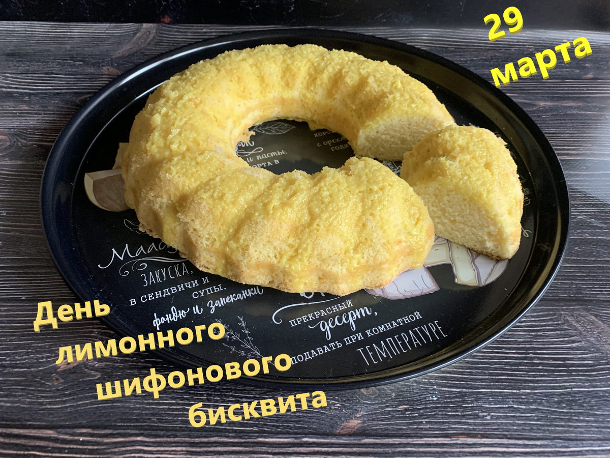 Ежегодно 29 марта отмечается День лимонного шифонового бисквита Шифоновый бисквит отличается от других бисквитов. В состав не добавляют сливочное масло, а используют растительное. Белки отделяются от желтков и взбиваются по отдельности. Такие бисквиты бывают разные: шоколадные, лимонные, с добавлением орехов и т.д. Бисквиты получаются мягкими и сочными, к тому же не засыхают и не твердеют, что позволяет в них добавлять мороженое или крем, которые требуют последующего замораживания. Вы пробовали шифоновые бисквиты/тортики?