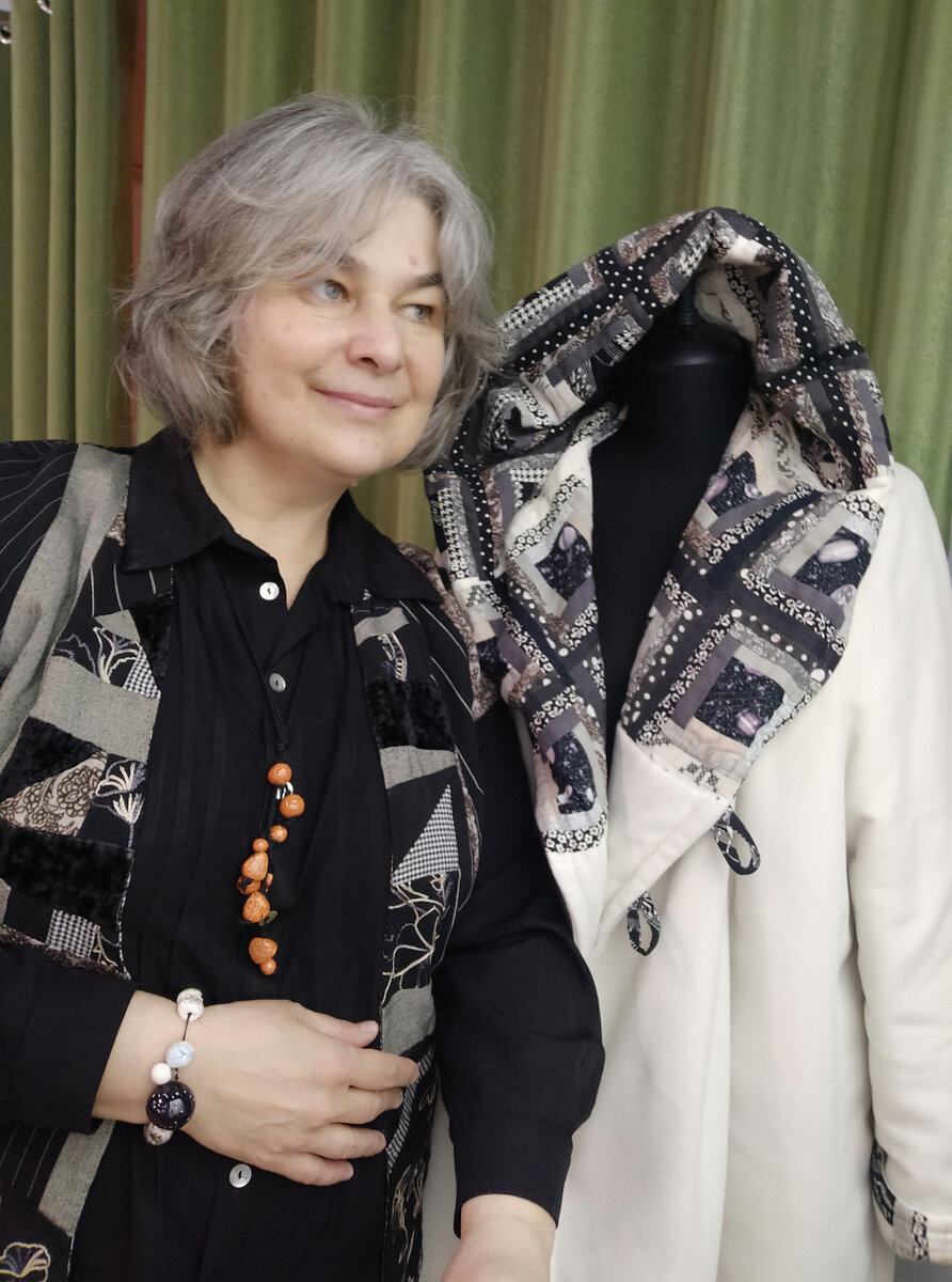 Когда я его сшила, полы смыкались. Честное слово! Правда, снимков не нашлось, но я же помню. Вначале было платье, в процессе пошива которого образовались лоскутки с фрагментами вышивки (это ткань такая, не я вышивала). Платьишко любимейшее висит в шкафу и ждëт, когда я обратно в него схудну. Собрав в кучку мелкое лоскутное вышитое богатство и всë, что было у меня чëрного с разными серыми вкраплениями и добавив плюш на спинку, я начудила жилеточку. Самых древних жилетных снимков не нашлось, вот примерно так как-то, год 2015-ый, наверное. Тут уже я округлее, чем задумано☺ Лоскутки в полотно полочки собраны спонтанно, бессистемно, как я люблю. Сшито всë вручную, машинки у меня тогда не было. Кстати, платье на снимках выше тоже было сшито вручную. Также вручную я шила все свои наряды периода жизни в Великом Новгороде. Посмотрите, на фото ниже юбка - узнаëте, и из неë детали жилета. Выкройку для жилетика, как и все выкройки, добываю из журнала "Бурда", единственное издание, к