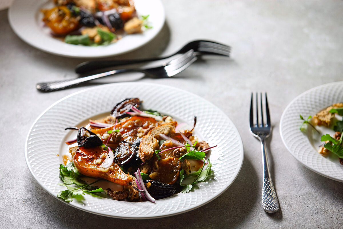 Теплый салат с томленой грушей, черносливом и грецкими орехами
