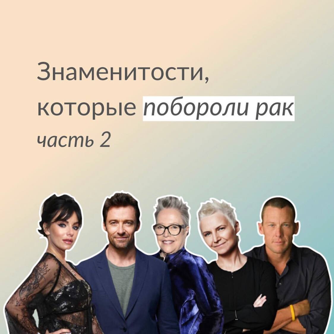 Делимся историями Хью Джекмана, Кэти Бейтс, Светланы Сургановой, Юлии Волковой и Лэнса Армстронга ⭐️ 1. Хью Джекман: рак кожи В 2013 году актер обнаружил странное пятнышко у себя на носу. Супруга уговорила его обратиться к врачу, и не зря – это оказался рак кожи, базалиома. Хью Джекман сразу же начал проходить лечение, и после нескольких операций и курсов лекарственной терапии болезнь отступила. После этого случая актер стал уделять большое внимание своему здоровью. Он регулярно проходит осмотры и пользуется солнцезащитными кремами, чтобы обезопасить себя от рецидива. 2. Кэти Бейтс: рак яичников, рак груди О раке яичников актриса узнала в 2003 году. К счастью, стадия была ранней, и после операции и курса лекарственной терапии болезнь отступила. Однако в 2012 году у Кэти Бейтс обнаружили опухоль молочной железы. Артистка быстро решилась на мастэкт