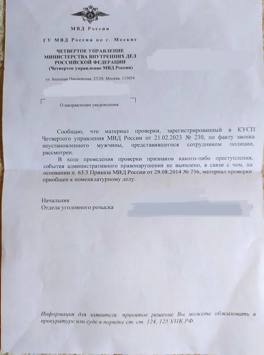 Я, конечно, понял, что это мошенник и отбился. Но ситуация меня "заела". Через интернет я нашел названный московский адрес. Действительно, Четвертое управление МВД РФ. И есть телефоны дежурного. Я набрал номер и описал ситуацию. Дежурный уточнил мои данные, номер телефона, с которого звонили, сообщил мне, что такого сотрудника у них нет и зафиксирова