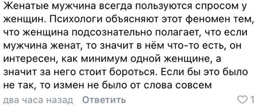 Друзья, привет! Наткнулась недавно на это. Выношу на ваш справедливый суд. Автор коммента утверждает, что женатые мужчины пользуются бОльшим спросом у женщин. Якобы, если парень нужен одной, значит, в нем определенно что-то есть. И наоборот: если до сих пор никто «не подобрал» (извините за грубость), то и мне незачем. Логика определенная есть. Но звучит сомнительно все равно. Охотиться преимущественно за женатыми — какая-то ерунда по-моему;) особенно если учесть, что все-таки немногие мужчины бросают жен ради любовниц. Изменяет-то, поди, каждый третий, а вот уйти осмелится / сочтет целесообразным далеко не всякий. Да и такое количество никчемных мужчин имеет жен, которые сторожат их пьяненьких возле проходной завода или у банкомата. Так что все же не показатель. А как думаете вы? Женатые мужчины пользуются повышенным спросом? Да / нет, почему? Работает ли то же самое с женщинами? Замужние пользуются повышенным спросом?
