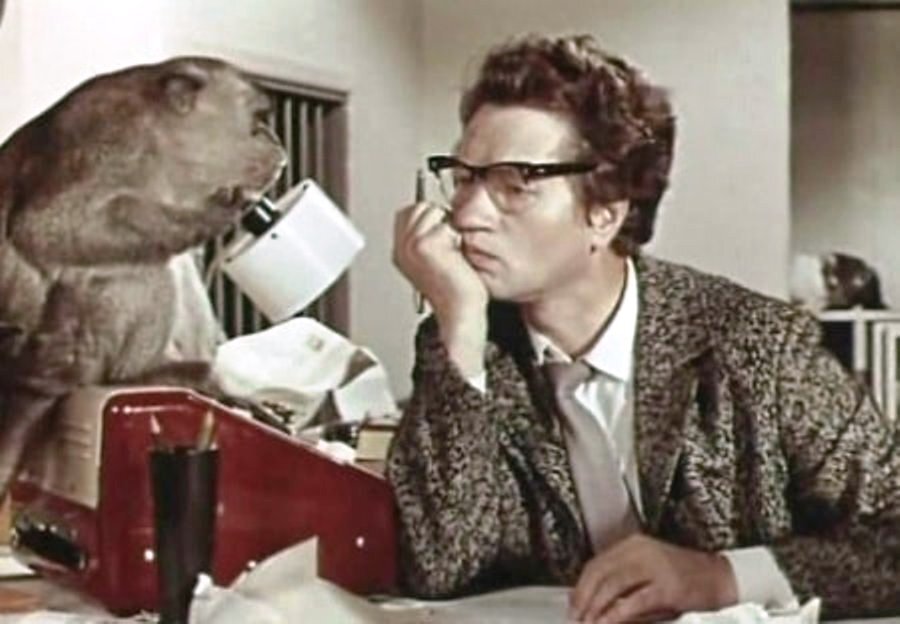 «Вот еще одна любовная история. Он молодой рабочий, она знатная парашютистка. Он поет и носит кружевное жабо, она острит и щеголяет в светлых брюках. Катер, мотороллер, танцы, цветы— дело двигалось к заветной цели. Что ж, мир да радость, совет да любовь! Ан нет, вырос на их пути хилый интеллигент, доктор наук, не умеющий играть на гитаре. И, конечно, все опошлил. Хлопают двери, звучат клинки, хмурится женщина в милицейском мундире, а обезьянка Геркулес задумчиво кушает диссертацию.