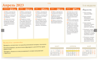 Редакция журнала «Справочник старшего воспитателя дошкольного учреждения» подготовила циклограмму дел на апрель. Она напомнит о ключевых делах и поможет распределить их в течение месяца. Подскажет, какие документы надо издать. Также вы увидите важные даты и комментарии от редакции о нововведениях, с которыми придется работать на конкретной неделе. Приоритетные задачи старшего воспитателя ✔️ Проведите консультацию переходу на ФОП ДО. На консультации выясните, все ли педагоги прочитали ФОП ДО и все ли им понятно. Чтобы обеспечить планомерную работу над образовательной программой детского сада, создайте творческую группу. Она разработает план, зафиксирует в нем этапы работы и ответственных. ✔️ Подготовьте положение о конкурсе среди педагогов на лучшую образовательную деятельность с детьми. По результатам проверок дайте рекомендации воспитателям. Остальные дела смотрите в циклограмме ниже Смотреть в полном размере >>>