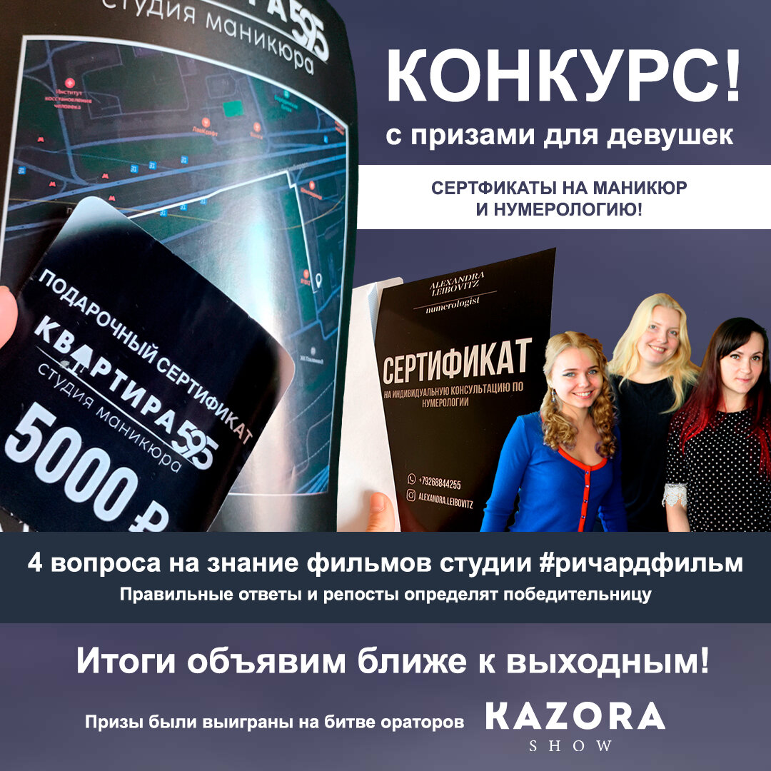 Сейчас будет дискредитация! По половому признаку! Жёсткая! Объявляем конкурс, в котором будут участвовать только девочки! Потому что у нас нет гендерно-нейтральных призов. Разыгрываем: 1. Два купона на сумму 1800 рублей студии маникюра “Квартира 595”. Маникюр, снятие, покрытие гель-лаком и т.д. 2. Один подарочный сертификат студии маникюра “Квартира 595” на сумму 5 000 рублей. 3. Сертификат на одну бесплатную консультацию по нумерологии специалиста Александры Лейбовиц. Недавно Олег выиграл все эти призы в битве ораторов KAZORA SHOW. И мы решили порадовать участниц нашей студии! Мы не можем участие поощрять деньгами, пока являемся некоммерческой студией. Но всегда рады передать призы от партнёров. Итак, в комменты к посту, в сообщения группы ВК, в директ запрещённой соцсети или иным способом (но чтобы мы увидели) надо отправить правильные ответы на четыре вопроса: Ваш ответ: _____________ Ваш ответ: _____________ Ваш ответ: _____________ Ваш ответ: _____________ Правильные ответы, напи