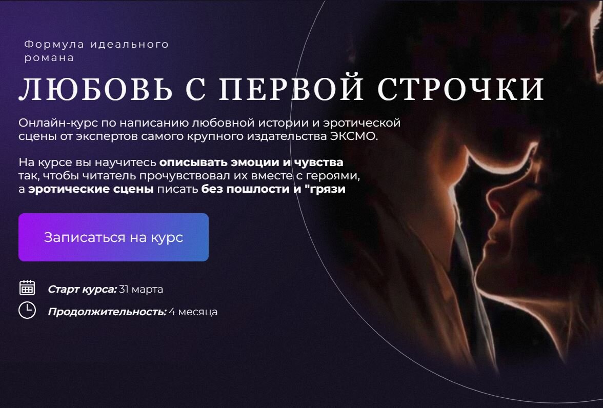 Только что закончился бесплатный курс от ЭКСМО, где мы коснулись таких интересных вопросов, как Признавайтесь, вам понравилось? Если однозначно "ДА" и вы хотите продолжение в подробностях, то чтобы полноценно научиться писать любовные линии, можно продолжить погружение в тонкости на курсе «Любовь с первой строчки», где редакторы ЭКСМО во всех подробностях рассказывают о создании сентиментальной прозы. СУПЕР-БОНУС ДЛЯ ВАС: EWA и ЭКСМО дарят подарки всем новым участникам курса «Любовь с первой строчки»!