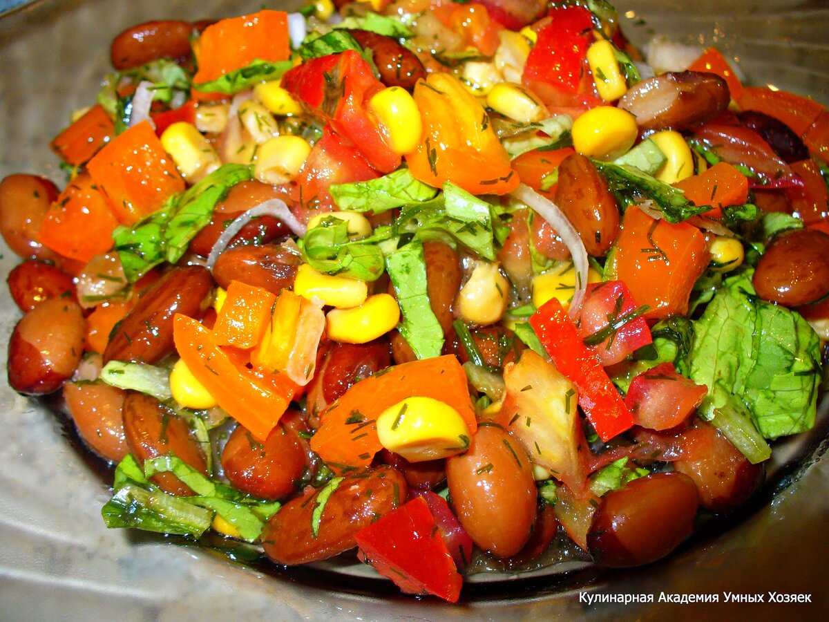 Со всеми, кто сегодня вечером решил заглянуть в Кулинарную Акдемию, делюсь рецептом замечательного сборного салата с помидорами, кукурузой и фасолью. Сочный, аппетитный, питательный, радующий глаз и не отяжеляющий желудок, такой салатик – идеальный вариант для постящихся и для тех, кто решил ближе к лету перейти на более легкие блюда😉