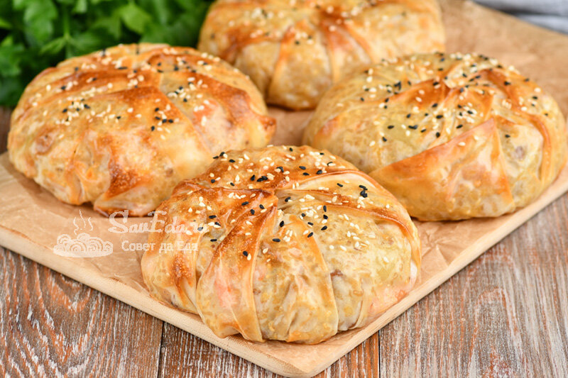 Такую подачу использую, чтобы порадовать красотой близких на обед или ужин и для праздничного стола. Для этого прекрасно подходят блюда из круп с овощами и мясом, а еще жареное мясо небольшими кусочками с овощами. Способ очень простой, легкий, а результат отличный. Сверху блюдо получается с хрустящей корочки и выглядит просто замечательно. Порции 4 Время подготовки 15 минут Время приготовления 10 минут Ингредиенты Инструкции 1. Для подачи используем тесто фило. Предварительно его размораживаем, берем 4 листа, накрываем их влажным полотенцем, чтобы не подсохли. Оставшиеся листы снова сворачиваем и замораживаем или готовим другие блюда (например, выпечка). 2. У разных производителей теста фило разная толщина листов. У меня в пачке весом 500 г идет 9 листов, это довольно толстые листы. Есть пачки весом 250 г, но листов там 8 шт., они очень тонкие, тогда их берем по 2 листа на порцию. Листы теста по одному смазываем растительным маслом (удобно делать пальцами). 3. Берем тесто пальцами за с