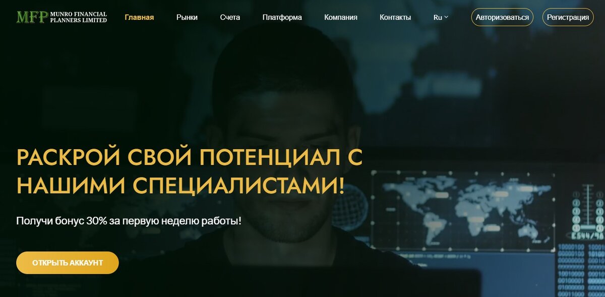 В наше время все больше финансовых организаций сулят получение прибыли. Некоторые предлагают инвестировать денежные средства и получать пассивный доход, некоторые - чуть ли не полноценную занятость и трудоустройство, а есть и такие, которые предлагают принять участие в торгах на мировой бирже. О последнем виде заработка и пойдет речь в нашем обзоре. Что за компания Munro Financial Planners Limited? Munro Financial Planners Limited - это форекс брокер. Организация была основана в 2012 году в Великобритании (Лондон), длительное время работала в странах Европы, а в 2020 успешно вышла на рынок стран СНГ и стала достойным конкурентам мировым лидерам на Форекс. Компания работает легально, подчиняется европейскому регулятору, номер лицензии в реестре 07973264. Преимущества Основным преимуществом этого брокера является широкий выбор активов для осуществления торгов. Инвестировать можно в: валютные пары, золото, акции, CFDs, сырье. Позволительно выбирать как один определенный актив, так и сраз