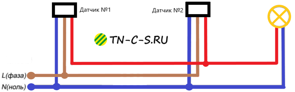 Всем привет. Подключение двух датчиков движения. Бывают ситуации, когда радиуса действия одного датчика движения не хватает – длинные коридоры, разные углы дома и т.п. В этом случае потребуется установка дополнительного датчика движения. Посмотрим, как их можно подключить. Для начала рассмотрим подключение двух стандартных датчиков движения. Под стандартными я понимаю датчик с тремя проводами (фаза, ноль и управление) без дополнительных “хитрых” настроек и переключателей (регулировка времени и освещенности не в счет). Схема подключения двух датчиков движения Схема подключения двух датчиков движения будет выглядеть как-то так: В принципе, все тоже самое, что и с одним датчиком, только добавляется дополнительный провод “управления” от второго датчика. По сути мы должны объединить два этих провода и уже с той клеммы взять питание на светильник. В результате при срабатывании любого из датчиков движения на светильник будет подаваться питание – что нам, в общем-то, и нужно. Подключение по сх