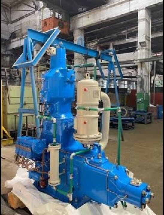 Описание компрессора 402ВП-4/220 - в состав компрессорной установки входят: компрессор, газоохладители, системы охлаждения, автоматического управления и защиты. Компрессор 402ВП-4/220 стационарный, поршневой, крейцкопфный, пятиступенчатый, угловой, с водяным охлаждением, со смазкой цилиндров и сальников. Компрессор включает следующие основные узлы: базу, цилиндры, систему охлаждения, электродвигатель. База компрессора 402ВП-4/220 состоит из унифицированных узлов кривошипно-шатунного механизма (коленчатого вала, шатуна, крейцкопфа), рамы, блока смазки механизма движения и лубрикатора. Рама чугунная, литая, коробчатой формы, с внутренними ребрами усиления. В верхней части рамы предусмотрены плотно закрываемые крышками люки, обеспечивающие доступ к деталям механизма движения. Нижняя часть рамы служит резервуаром для масла. Для крепления цилиндров компрессора 402ВП-4/220 к раме имеются специальные приливы. В отверстиях поперечных ребер установлены крейцкопфные чугунные гильзы, служащие нап