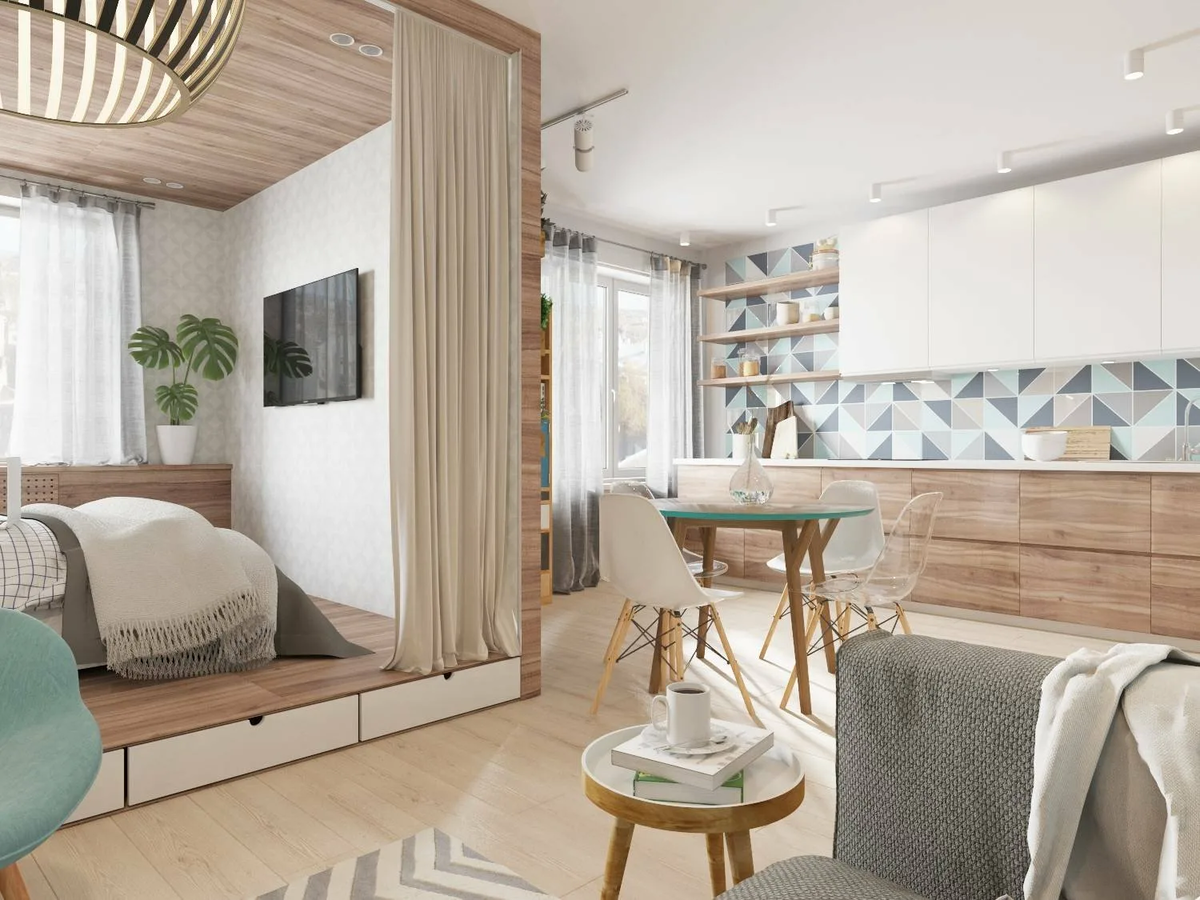 Разные уровни пола, перегородки или ширмы. Эти методы позволяют визуально разделить пространство на функциональные зоны и создать ощущение отдельных комнат.