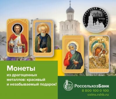 Россельхозбанк в Алтайском крае и Республике Алтай предлагает широкий выбор монет из драгоценных металлов, которые можно приобрести в качестве подарка к празднику Светлой Пасхи и другим памятным событиям. В коллекции Алтайского филиала представлены монеты, выполненные из серебра 925 и 999 пробы, чеканки пруф, на которые нанесены изображения православных святых: Пантелеймона; Спиридона; Матроны Московской; Казанской Божьей матери и других. В частности, оригинальная прямоугольная монета «Матрона» из серебра высшей пробы украсит любую коллекцию и станет красивым памятным подарком. Монета упакована в стильный футляр. По центру монеты расположен образ Матроны Московской (цветная печать). Вдоль канта по бокам монету украшают рельефные узоры, внизу надпись «Матрона». Монета «Казанская-20» очень ценна для православных верующих – на ней изображен один из самых почитаемых образов Пресвятой Богородицы. В России чудотворную икону Казанской Божией Матери издавна именуют Заступницей. Пресвятая Богор