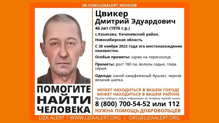 В Коченевском районе Новосибирской области без вести пропал 46-летний житель села Казаково Дмитрий Цвикер, местонахождение которого неизвестно с 20 ноября 2022 года. Об этом рассказали в поисково-спасательном отряде (ПСО) «ЛизаАлерт» в социальной сети «ВКонтакте».