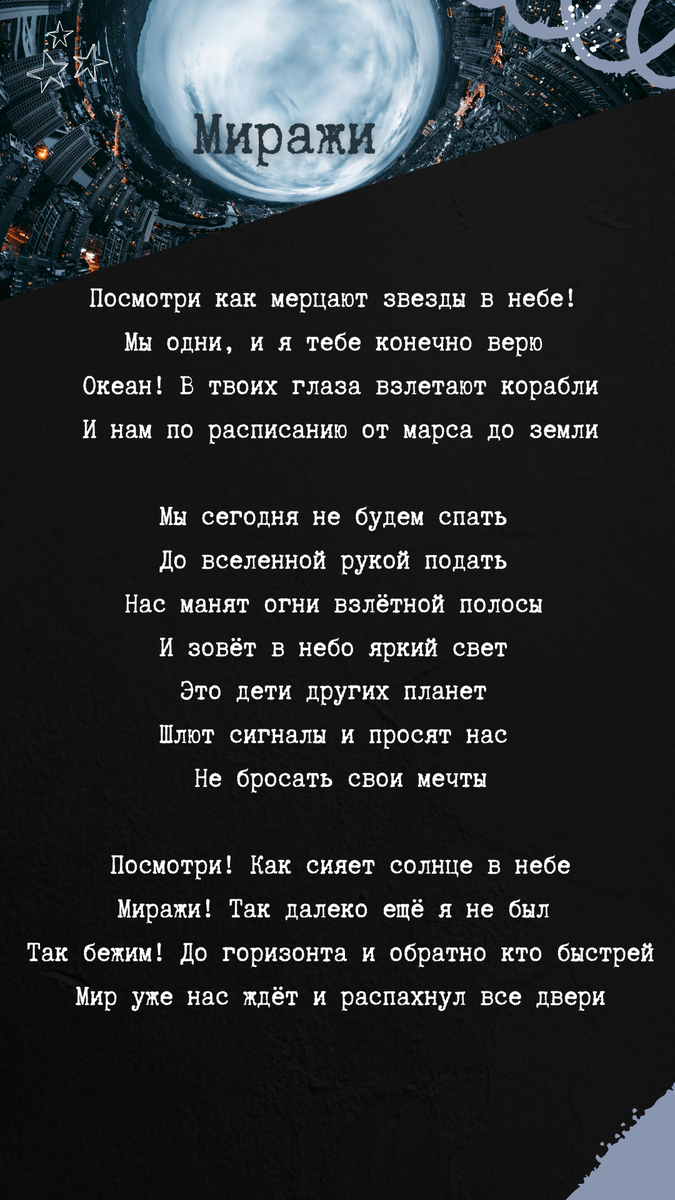 Слушайте, сохраняйте в плейлисты, не забывайте тыкнуть на пальчик вверх, вам не сложно - нам приятно) Посмотри как мерцают звезды в небе! Мы одни, и я тебе конечно верю Океан! В твоих глаза взлетают корабли И нам по расписанию от марса до земли Мы сегодня не будем спать До вселенной рукой подать Нас манят огни взлётной полосы И зовёт в небо яркий свет Это дети других планет Шлют сигналы и просят нас Не бросать свои мечты Посмотри! Как сияет солнце в небе Миражи! Так далеко ещё я не был Так бежим! До горизонта и обратно кто быстрей Ведь мир уже нас ждёт и распахнул все двери