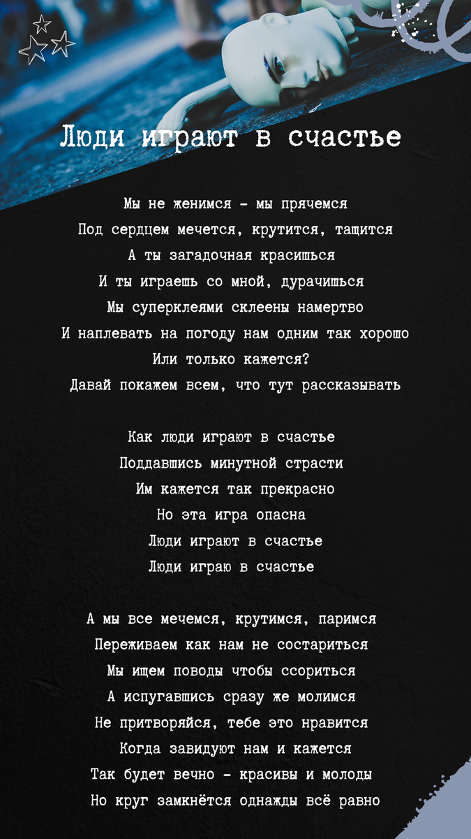 И не забывайте про сердечко под постом) Мы не женимся - мы прячемся Под сердцем мечется, крутится, тащится А ты загадочная красишься И ты играешь со мной, дурачишься Мы суперклеями склеены намертво И наплевать на погоду нам одним так хорошо Или только кажется? Давай покажем всем, что тут рассказывать Как люди играют в счастье Поддавшись минутной страсти Им кажется так прекрасно Но эта игра опасна Люди играют в счастье Люди играют в счастье А мы все мечемся, крутимся, паримся Переживаем как нам не состариться Мы ищем поводы чтобы ссориться А испугавшись сразу же молимся Не притворяйся, тебе это нравится Когда завидуют нам и кажется Так будет вечно - красивы и молоды Но круг замкнётся однажды всё равно