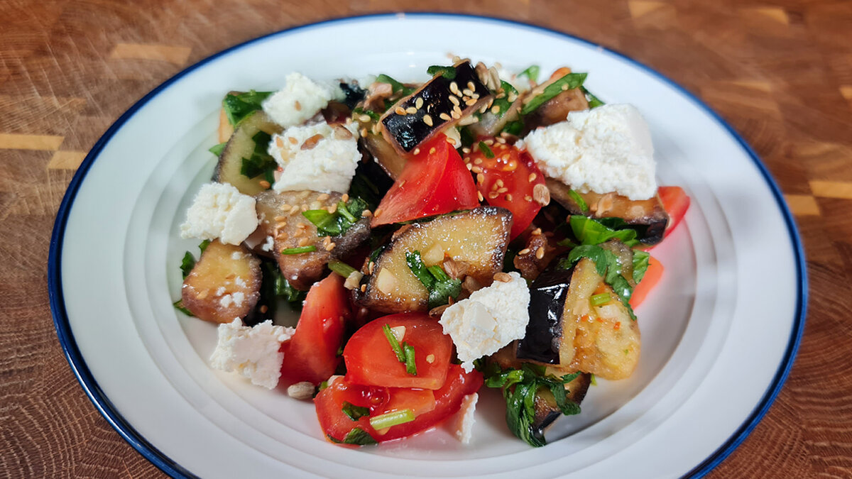 Салат с хрустящими баклажанами – это интересный и очень вкусный салат, который в разных его интерпретациях можно встретить во многих кухнях мира. Основной фишкой этого салата являются баклажаны, обжаренные во фритюре. При таком способе приготовления они становятся хрустящие снаружи и нежные внутри. Это очень вкусно! Ещё отмечу, что хрустящая корочка у баклажанов охотно впитывает все добавленные в салат соусы и делает их ещё вкуснее! В данном рецепте я приготовил азиатскую вариацию салата с хрустящими баклажанами, добавив к ним кисло сладкий соус. Попробуйте повторить, и вы не пожалеете! Приятного аппетита! ➡МОЙ КУЛИНАРНЫЙ КАНАЛ: https://www.youtube.com/c/neslojno === Для рецепта Вам понадобится === Баклажан – 1шт; Помидоры – 2шт; Чеснок – 2зуб; Твороженный сыр – 50гр; Мята; Базилик; Кинза; Оливковое масло – 2ст.л; Кунжутное масло – 1 ст.; Семена подсолнечника – 5гр; Кукурузный крахмал; Растительное масло – 0.5л; Соль; === Приготовление === Предварительно помытый и обсушенный баклажан и